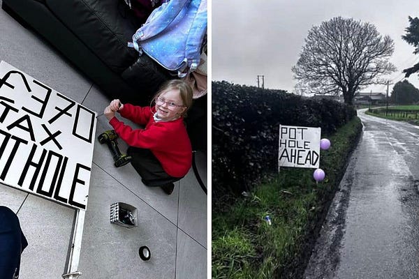 Father and daughter cover Killyman in pothole signs… and the community are ‘holey’ grateful!